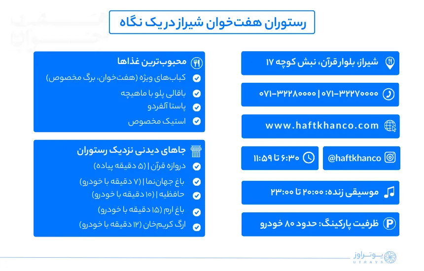 - شماره تلفن رستوران هفت خوان شیراز: 07132270000، 07132280000 رزرواسیون: 09177878400