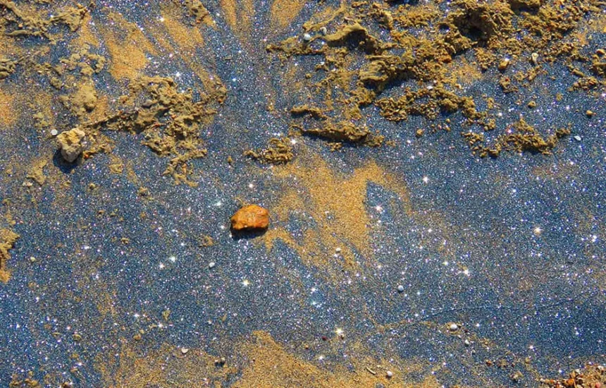 کانیها و صدفهای پودرشده درخشان در ساحل نقره قشم