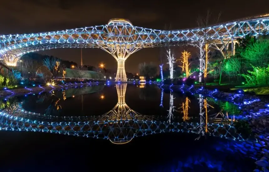 روشنایی پل در طول شب محیط اطراف را روشن میکند و چشمانداز چراغهای شهر و پارکهای مجاور، تجربهای متفاوت از فضای شهری ارائه میدهد. برای آشنایی بیشتر با این سازه و مسیرهای دسترسی، مقاله پل طبیعت تهران را مطالعه کنید.
