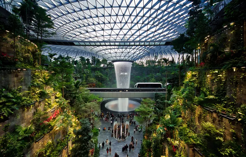 فرودگاه چانگی سنگاپور (SIN) در جایگاه دوم نماد جهانی نوآوری و مهماننوازی است. این فرودگاه میزبان مجتمع خیرهکننده جواهر ( Jewel ) است، گنبد شیشهای که باغهای سرسبز، بلندترین آبشار داخلی جهان و پارک سرپوشیده کانوپی را در خود جای داده و تجربهای طبیعی و هنری برای مسافران فراهم کرده است.