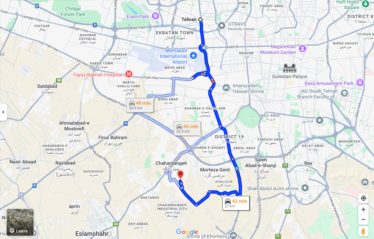 - فاصله چهاردانگه تا تهران با خودرو شخصی: در شرایط عادی ترافیک بین ۲۰ تا ۳۰ دقیقه