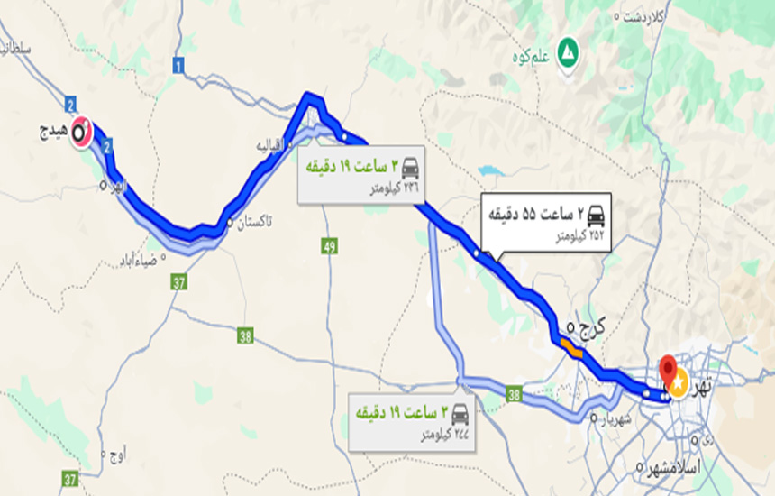 زمان سفر با خودرو از هیدج به تهران چقدر طول میکشد؟
