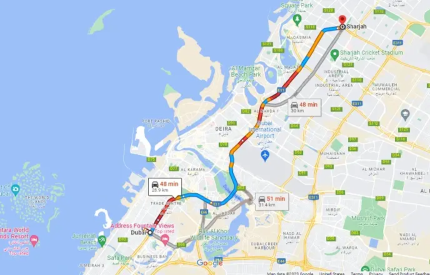 نکته مهمی که باید مدنظر قرار دهید، ترافیک است. بهویژه در ساعات اوج (معمولاً صبحها هنگام رفتن به محل کار و عصرها هنگام بازگشت)، همین مسیر کوتاه ممکن است بیش از یک ساعت طول بکشد. درحالیکه در زمانهای خلوت، سفر بین شارجه و دبی کمتر از ۳۰ دقیقه زمان میبرد؛ بنابراین، وقتی از فاصله شارجه تا دبی صحبت میکنیم، بهتر است علاوهبر بعد مسافت، به شرایط ترافیکی و انتخاب مسیر نیز توجه کنیم. قبلاز سفر به دبی، پیشنهاد میکنیم که مقاله بیوگرافی تماموکمال شهر دبی را مطالعه کنید.